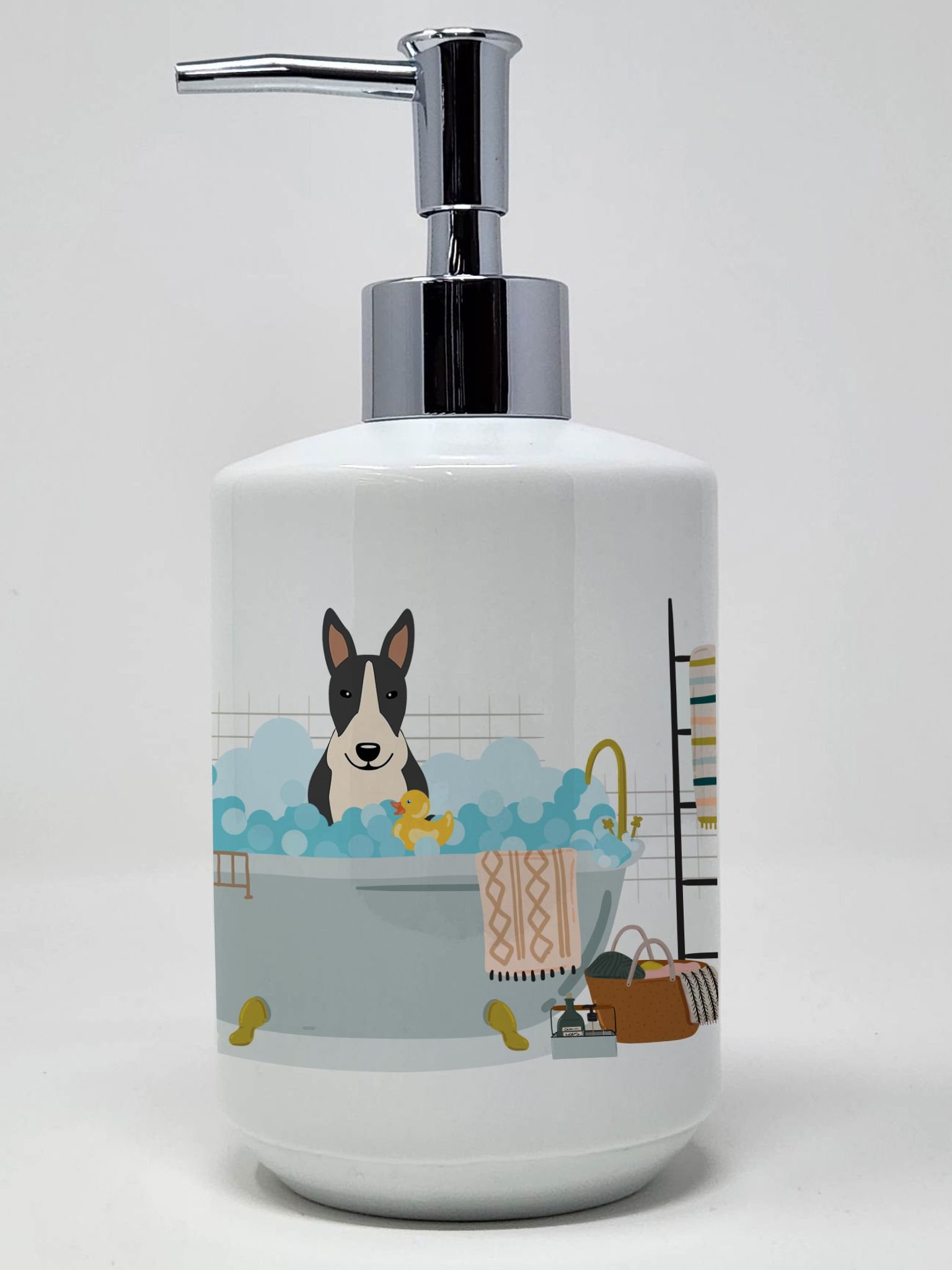 Ceramic Soap Dispenser featuring breed specific Bull Terrier artwork. This Ceramic Soap Dispenser is from Caroline's Treasures collection Rubadubdub Dogs in a Tub. Revitalize your kitchen or bathroom decor with the Decorative Ceramic Soap Dispenser from Caroline's Treasures. This refillable dispenser marries practicality and style, serving as a vibrant art piece in addition to its primary function. The dispenser's exterior boasts colorful artwork from one of Caroline's Treasures' artists, wrapping around the dispenser to add a touch of personality and color to your space. Measuring approximately 7 1/4 inches high and about 3 1/2 inches in diameter, it is the perfect size for any countertop. The dispenser features a sturdy pump nozzle, which screws easily into the top of the ceramic dispenser. With a simple press, you can conveniently dispense your preferred liquid soap, lotion, aromatherapy essential oil blend, shampoo, body wash, or even massage oils. The Decorative Ceramic Soap Dispenser is more than a functional item - it's a statement piece that adds a unique touch to your bathroom or kitchen decor, transforming everyday rituals into an artful experience. This Ceramic Soap Dispenser is from Caroline's Treasures Dogs category of products.