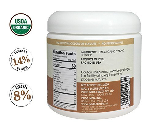 Pride Of India - Organic Cacao Powder (From premium Criollo Beans) - Iron & Fiber Rich Superfood - 8oz (227gm) Jar Pride Of India - Organic Cacao Powder (From premium Criollo Beans) - Iron & Fiber Rich Superfood - 8oz (227gm) Jar Pride Of India - Organic Cacao Powder (From premium Criollo Beans) - Iron & Fiber Rich Superfood - 8oz (227gm) Jar